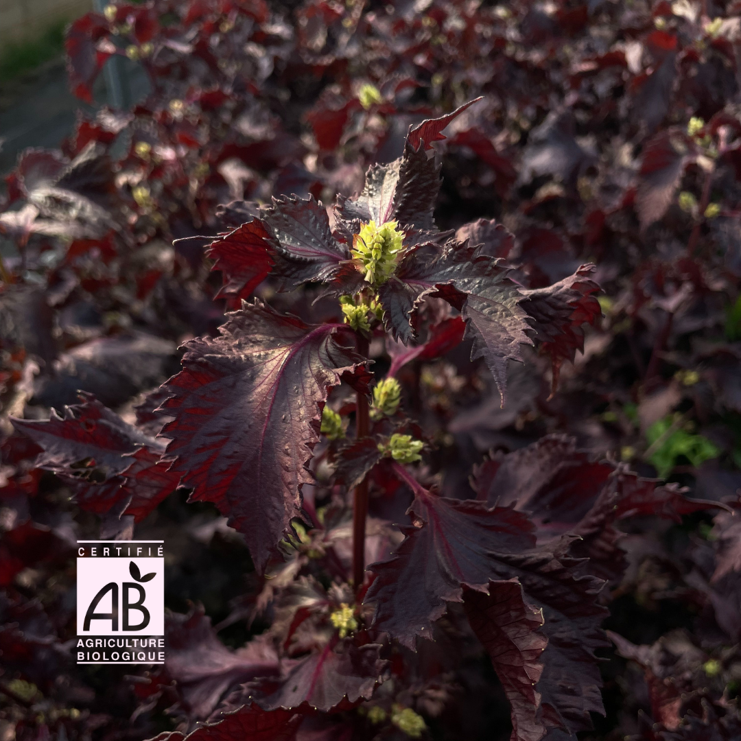 Aromate japonais odorant, magnifique feuillage frisé couleur prune, lustré. Inflorescences rose pâle avec bractées vert vif jusque tard dans la saison.